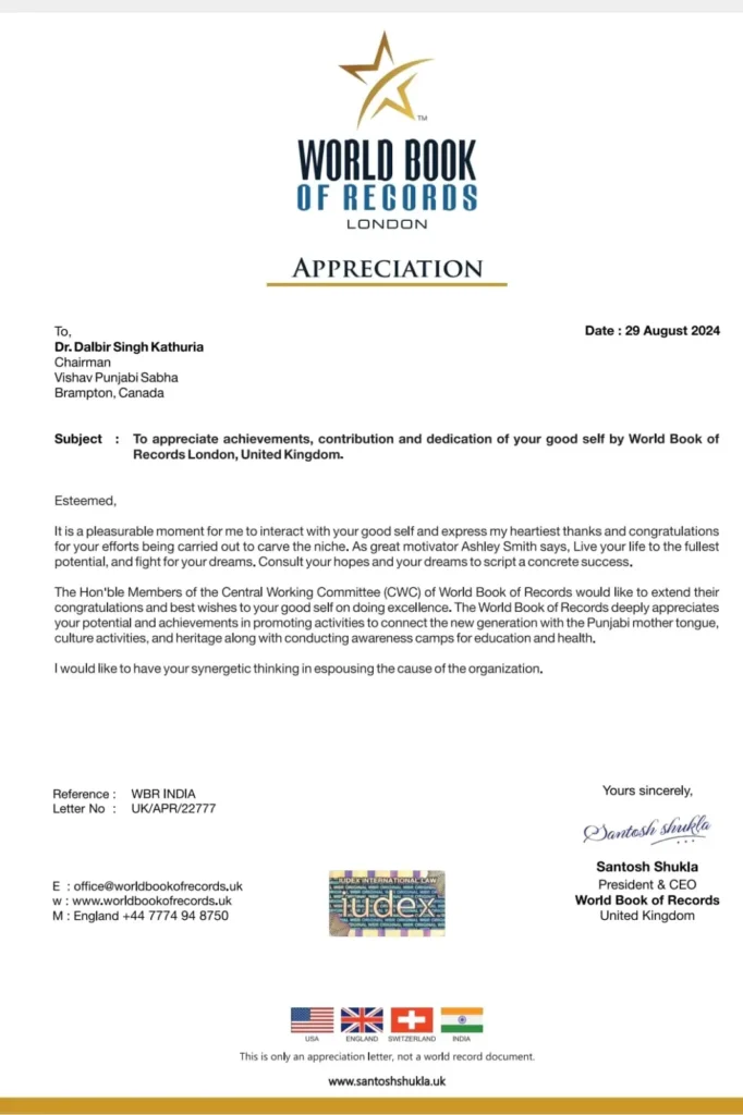 ਡਾ ਦਲਬੀਰ ਸਿੰਘ ਕਥੂਰੀਆ ਜੀ ਨੇ ਵਰਲਡ ਬੁੱਕ ਆਫ਼ ਰਿਕਾਰਡਜ਼ ਲੰਡਨ ਦੇ ਸੀ. ਈ. ਓ ਅਤੇ ਪ੍ਰਧਾਨ ਸ੍ਰੀ ਸੰਤੋਸ਼ ਸ਼ੁਕਲਾ ਅਤੇ ਸ ਕੈਲੇ ਜੀ ਦਾ ਧੰਨਵਾਦ ਵੀ ਕੀਤਾ । ਅਤੇ ਭਵਿੱਖ ਵਿੱਚ ਵੀ ਸਭਾ ਵੱਲੋਂ ਪੰਜਾਬੀ ਮਾਂ-ਬੋਲੀ ਦੇ ਪ੍ਰਚਾਰ ਤੇ ਪਸਾਰ ਲਈ, ਪੰਜਾਬੀ ਸੱਭਿਆਚਾਰ ਤੇ ਵਿਰਸੇ ਅਤੇ ਸਮਾਜ ਸੇਵਾ ਦੇ ਕਾਰਜਾਂ ਵੱਧ ਚੜ੍ਹ ਕੇ ਆਪਣਾ ਯੋਗਦਾਨ ਪਾਉਂਦੇ ਰਹਿਣ ਦਾ ਵਚਨ ਦਿੱਤਾ।